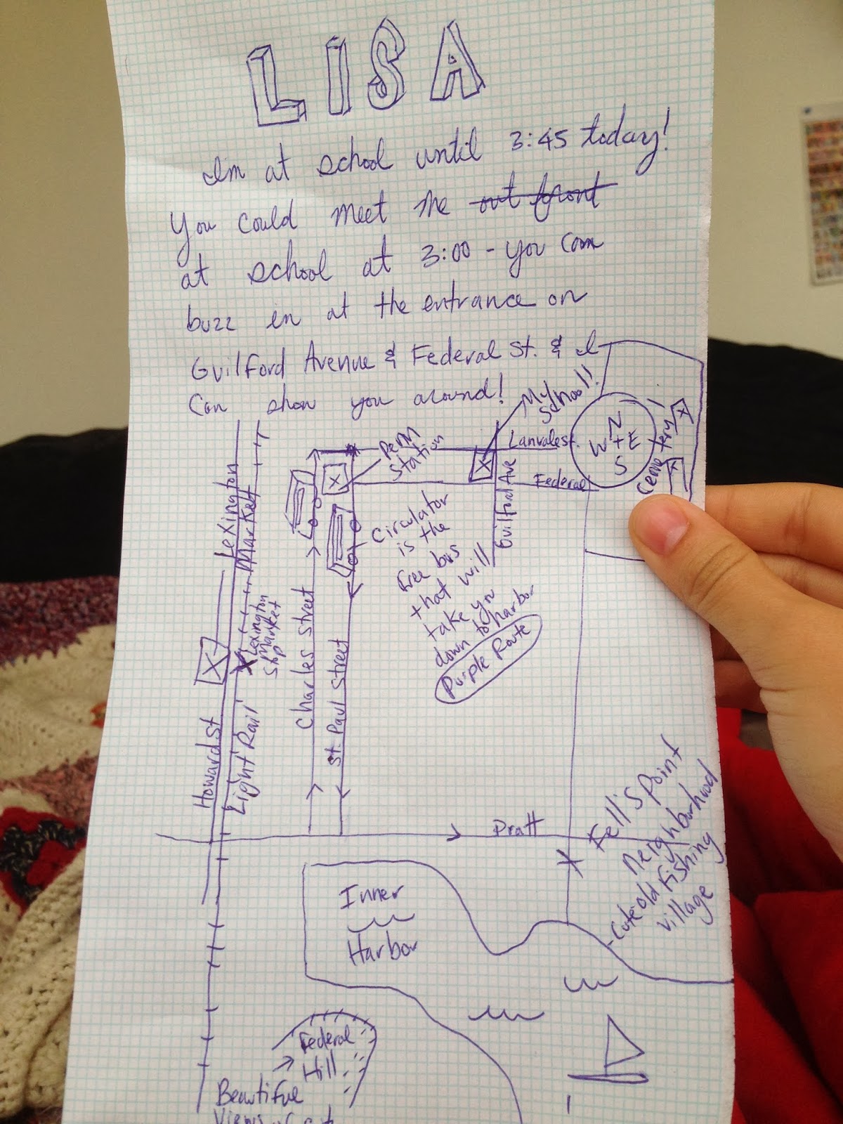 I woke up a little hungover and found a map on the floor that Kitt had drawn for me- explaining how to get to the harbor to buy some so I figured I might as well just go. My plan was to quickly hop downtown, eat some, look for a halloween costume and then meet Kitt around 3pm at her school so she can give me tour. They filmed one season of the US series "The wire" at her school and I really wanted to go there but life is hard and you can´t always get what you want, especially if you have the orientation skills of a potato.